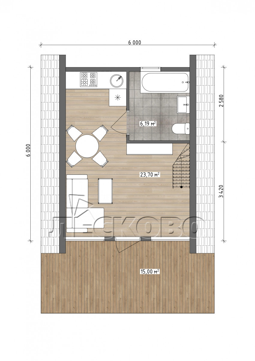 • Чистовые полы на верандах и балконах: палубная доска 35х144 мм сорт АБ,