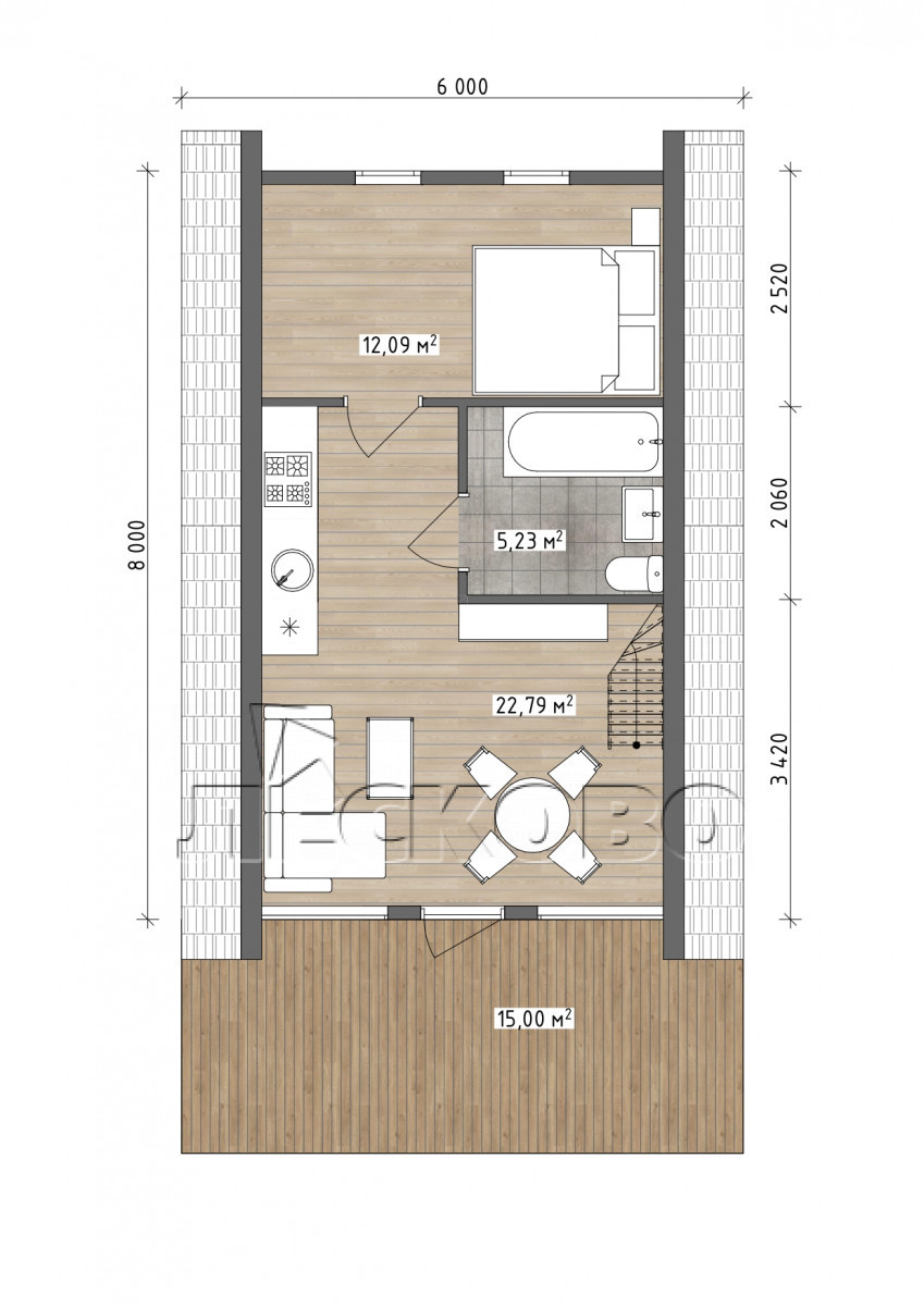 • Чистовые полы на верандах и балконах: палубная доска 35х144 мм сорт АБ,