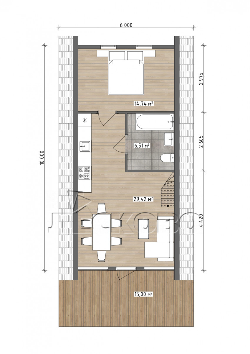 • Чистовые полы на верандах и балконах: палубная доска 35х144 мм сорт АБ,